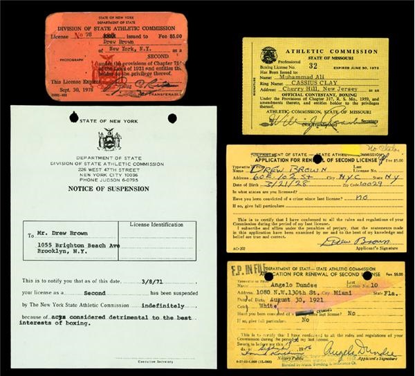 A group of Muhammad Ali related boxing licenses including: Muhammad Ali, 1972, unsigned; Angelo Dundee, 1956, signed with a photo; Drew "Bundini" Brown, 1969, signed; Drew "Bundini" Brown, 1978, unsigned; and a Drew "Bundini" Brown, 1971, Notice of Suspension. Overall EX-MT condition.