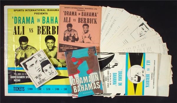 Fine material from Ali’s last fight the “Drama in Bahama” includes some true rarities. 1) Attractive and important site poster measures 14.75x18.25” and pictures the two fighters in a purely Bahamian look. Tickets are priced $1000 down to $50. Folded o/w EX-MT. 2) Sporty handbill features the same artwork as the larger poster. Fragile paper gives credence to the fact that this is nearly impossible to find. 8.5x11” and EX-MT. 3) Unused sticker with heads if the two fighters and an interesting African look. 5.25x6” mint. 4) Rare book Drama in Bahamas by James Cornelius is author signed with original dj. Nice inscription regarding “Ali’s last fight.” NRMT. 5) Press kit from the fight includes several press releases inside and appears complete. VG-EX.