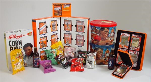 A collection of Muhammad Ali endorsed food products, including: Muhammad Ali Potato Chips, in five different flavors; a bag of Hot and Spicy Corn Chips; (2) bags of White Cheddar Cheese Popcorn; (32) bags of Spicy Chili Cheese Popcorn; (2) Muhammad Ali Potato Chip Tins; a Muhammad Ali figural decanter in the box; (2) bottles of "Superstar Beer" and (4) Wheaties commemorative Ali collections.