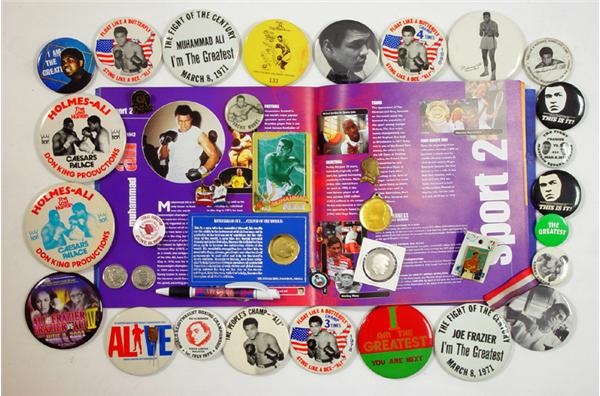 A group of 45 pins, medallions and coins depicting the "The Greatest" Muhammad Ali. There are 25 round pins, 10 metal pins and 10 medallions/coins. Includes site pins from Ali vs. Frazier, Holmes vs. Ali, a Sonny Liston pin, and many others. Overall Near Mint condition.