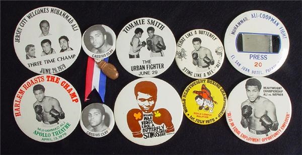 A group of ten rare and desirable Muhammad Ali pins including: a press pin from the Ali-Coopman fight; Harlem Roasts the Champ; Tommie Smith The Urban Fighter; Cassius Clay with Ribbon and Glove; Ali vs. Bugner Kuala Lumpur Site Pin; Ali vs. Wepner Site Pin; Muhammad Ali Floats Like a Butterfly, Stings Like a Bee; Jersey City Welcomes Muhammad Ali; and a Cassius Clay pin. Overall Near Mint condition.