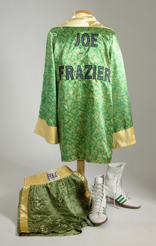 A complete costume worn by James Toney as "Joe Frazier" in the 2001 film "Ali." The costume was worn in the climactic Ali vs. Frazier I bout, and includes a robe, trunks, and shoes.