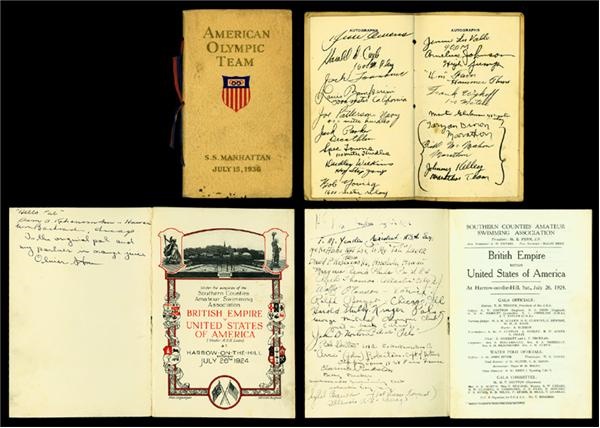 From the career of 4-time Olympian Fred Lauer who was a multiple medal winner and led the United States team into the stadium for the Opening Ceremonies in 1936 Berlin. 1) Elaborate passenger list from aboard the S.S. Manhattan when the “American Olympic Team” sailed to Berlin. 66 Olympian signatures: Jesse Owens, Archie Williams, Cornelius Johnson, Spec Townes, Frank Wykoff, Glenn Hardin, John Woodruff, Glenn Morris, Ralph Metcalfe, Glenn Cunningham, Mack Robinson (Jackie’s brother), plus Sam Stoller & Marty Glickman (victims of Hitler’s anti-Semitism). 6x3.5” book is EX, sigs NRMT. 2) “British Empire v. United States “ English swimming program with 26 sigs including Duke Kahanamoku & Johnny Weismuller. Spine separated o/w EX-MT, sigs NRMT. LOA.