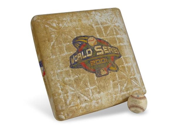 Lifted from the hollowed grounds of Yankee Stadium following the Bombers Game Five victory over the Diamondbacks during the 2001 World Series, we offer this, “Original Hollywood Base”. Its top is screened with the colorful, “World Series 2001” logo while along the sides three of the four decorative plates remain (missing Yankees). The entire “first” base is covered in field dirt and other remnants indicating significant use. The gold stamped Rawlings Official World Series (Selig) baseball was used in play during the final game of that see-saw series and displays all expected use along with the blue ink signature of second baseman Craig Counsell. Complete with authenticating hologram from Major League Baseball.