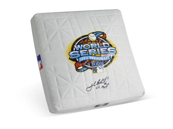 A trio of unique and beautiful display pieces - each one an authentic Major League base produced for the 2003 World Series between the New York Yankees and the Florida Marlins. Each base carries the MLB authenticating sticker, and all are unused, offered in NM-MT condition, bearing the autographs of Josh Beckett (signed, "WS MVP."), Alex Gonzalez and Ugueth Urbina of the Florida Marlins.