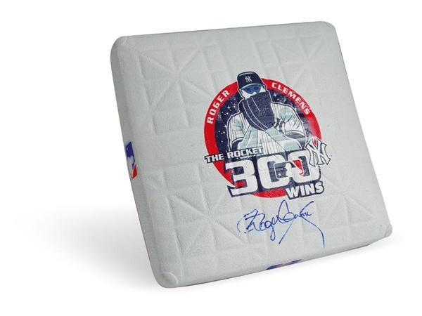 Unquestionably the most overpowering pitcher of his era, Roger Clemens continues to defy the hands of time much like his boyhood idol Nolan Ryan. After two decades in the Bigs and a trade to his hometown Astros, The Rocket has been revitalized and is displaying the form that has earned him an unprecedented six Cy Young Awards. Just one year ago the eyes of the baseball world were again focused on the future Hall of Famer as he closed in on the most significant milestone of his career-300 wins. And on June 13, 2003 in front of a sold out crowd at Yankee Stadium Clemens got that long awaited “W” against the visiting Cards and joined the ranks of such men as Seaver, Spahn, and his hero Nolan Ryan. To commemorate the event these custom plates were created for use during the games in which Roger had an opportunity to collect #300, though this one never took the field. This “Original Hollywood Base” is screened with the “Roger Clemens-The Rocket-300 Wins” logo and has either a “Yankee” team logo plate or “MLB” logo plate on each side panel. His bold blue sharpie signature grades an “8” out of “10” due to some minor breaks in the “R” of “Roger” and “s” of “Clemens”but presents nicley against the stark white rubber of the plate. Carries the MLB authentic hologram sticker.
