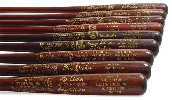 Here it is, all the work has already been done for you. A complete set of Hillerich & Bradsby and Louisville Slugger brown bats issued each year to honor the Cooperstown Inductees. All are present and accounted for from 1936 to 2004 and each one is numbered. Six years during this time period there was no induction, thus no bats were issued. These bats are in beautiful NRMT condition and engraved in gold with the names (script or block letter) of the respective year’s Hall of Fame enshrinees. These bats are very limited, only 500 of most were made. In recent years the production has increased to 1000 per year to satiate the desire by collectors for them. The numbers do not match on these bats but they do come with rights. Many of them even come with the original mailing boxes.