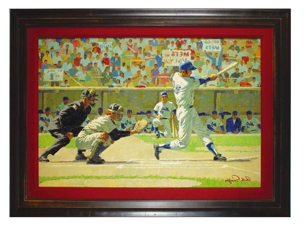 Arthur Sarnoff was one of the 20th Century's greatest American illustrators. Presented here is a 24x36" oil on canvas freeze framing in great detail the Mets Art Shamsky lining a rope to right field. You can almost smell the Georgia clay on a warm July afternoon at Shea circa 1969. The action is framed with a backdrop of the Mets's faithful showing their affection for that Miracle team. From the Charlie Sheen Collection.