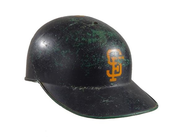 Old style flapless helmet has the original San Francisco Giants “SF” logo in front in superior orange on black. American Baseball Cap size 7 sticker on the inside tells the tale as does the equipment man’s matching “7” in black marker inside as well. Best of all is the orange and black “Mays” on orange and black Letraset tape. This was how all the Giants helmets were done and this well-worn tape perfectly matches the few other existing specimens from more Clark Kent type ballplayers who are more likely to be seen versus the Willie Mays “Superman.” Helmet has a large crack on the right side where Mays obviously flung it in a fit of passion. This gives this character as do the various scratches and paint wear. The best comes to you from the Charlie Sheen Collection via the ultimate Giants equi8epment guru: Dick Dobbins.