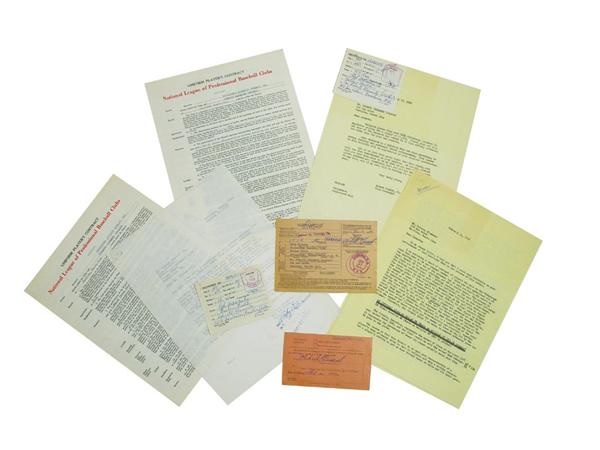 Fascinating assemblage of revealing material regarding a post rookie Roberto Clemente includes four Clemente signatures including an exceptional Player's contract for the Puerto Rican superstar.  Contract is signed in blue ballpoint and dated by Roberto Clemente, 2/3/1956 with an approved stamp of March 6, 1956 and stamped signatures of Warren Giles and Joe Brown.  Printed on same page is Clemente's address in Carolina, Puerto Rico.  Contract is EX+ overall and for the sum of $7,500.00 per season.  The original rejected contract in the amount of $7,000.00 is also included (unsigned) and signed by Branch Rickey.  The accompanying "rookie" documents include a typed letter signed by Clemente in blue ink, addressed to Rickey, rejecting the initial contract offered to him, and asking for a "substantial raise" based upon his performance over the last season.  Also included is the very detailed response letter in reply, from Rickey, explaining why Clemente was not deserving of a raise.  Lot also includes an employee card and postal service card - both signed in blue ballpoint by Clemente and both dated 1956.  An incredible collection of early and important paper with fabulous autographs from this adored baseball hero.