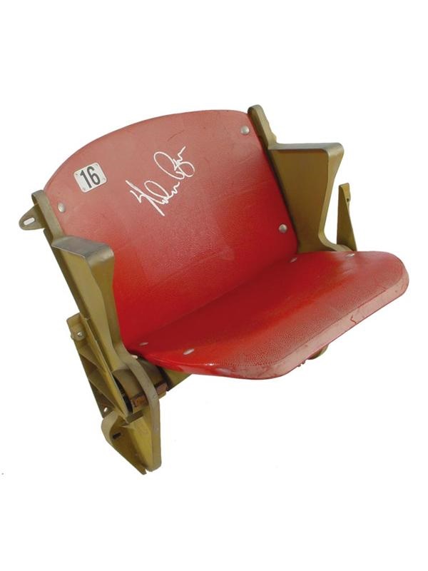Texas said goodbye to two of their favorites following the close of the 1993 season. Nolan Ryan said his final good-bye and hung up his cleats for good just as Arlington Stadium, the home of Texas baseball, was scheduled for demolition. But before they parted ways Nolan took the time to pen his oversized silver sharpie signature on the backing of this row seat.Flawless in every way the autograph grades a “10” out of possible “10”. The red plastic body owns a gold painted steel wall mount frame that exhibits only minor flaws on the underside. The seat's backing is affixed with a number “16” plate and is faded along the top end from exposure to the relentless Texas sun. Measures 28” high x 22” across.