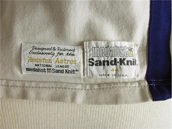 Nolan's classic pullover style jersey with four-color rainbow shoulder yokes is amongst the most popular with early eighties collectors and not to mention one of the most difficult to find.Screened with "Astros" and the lone star logo on front and "Ryan 34" sewn in navy on reverse. Tagged on the tail, "D&T Exclusively for the Houston Astros" and "Medalist/Sand Knit [size] 44." Great use is evident and can only be attributed to numerous mound appearances with Ryan. Signed on the left chest in black sharpie.