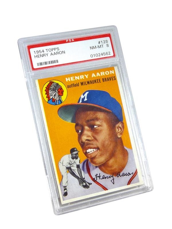 One of the best and most consistent hitters of all-time. Aaron is featured here on his 1954 Topps rookie card. It exhibits strong color and registration with sharp, NM-MT corners. Centering is favored just to the left. Very strong eye appeal.
