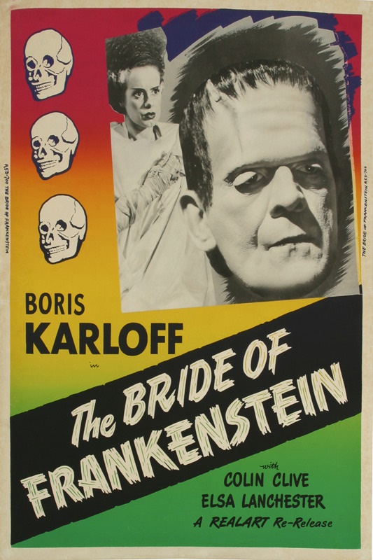 Colorful movie poster of the1958 re-release of the horror classic "Bride of Frankenstein" featuring Boris Karloff as "Frankie" and Elsa Lanchester ( with famed "Lightning Bolt" hairdo) as his bride. 40 X 30" poster with a large image of Karloff at the forefront and skulls lining the left side. Arguably, the greatest horror film ever made. Monster artifact of the original scream-theme flick. From the Forrest Ackerman Collection and is mounted on linen. EX-MT
