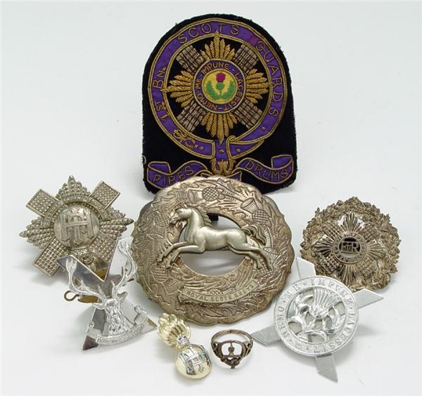 Incredible arcana from one lucky fan's once in a lifetime encounter with the Fab Four at their August 15, 1965 concert at Shea Stadium. The fan, Richard Rashenbaum, was invited backstage to meet them, and amazingly each gave him personal drum-corps medallions they'd worn on their hats or sweaters. Total of 6 silver or pewter medallions in all with inscribed crests from such as the Royal Scots Greys, and a patch from the Scots Guards. Each individually wrapped with the name of the Beatle who owned it. LOA from Rashbaum relating the entire story of the medallions.