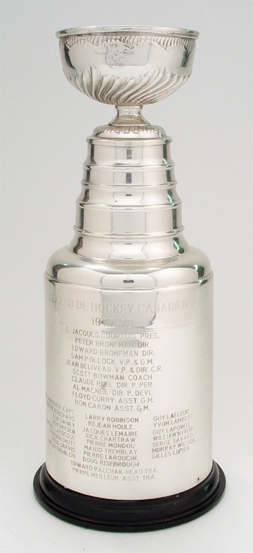 he Canadiens dominance continued in 1977-78 as they only fall off slightly from their record setting performance of the previous season, taking the best record again at 59-10-11, with 127 points. There would be no denying the Habs their 3rd straight Stanley Cup as the won the next 2 games by identical 4-1 scores as star defenseman Larry Robinson won the Conn Smythe trophy by setting up 17 Canadiens goals. Miniature “Grail” presented by the NHL to each member of the Montreal Canadiens to commemorate the '78 Stanley Cup Championship. At thirteen inches in height, this silver plated Cup is engraved with the names of the Habs players, management and staff under the heading “Club de Hockey Canadien, 1977-78". What a roster! Lafleur, Cournoyer, Dryden, Gainey, Shutt, Robinson. Lemaire, Lapointe, Savard and more! Green felt beneath the black wood base. In excellent condition. From the collection of a former Montreal Canadiens front office executive.