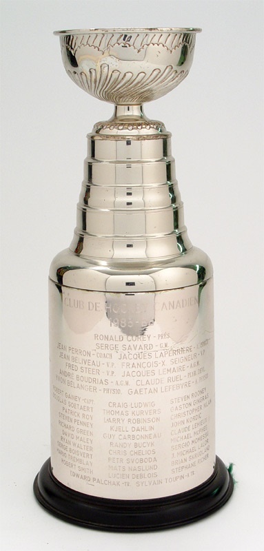With 20-year old Goalie Patrick Roy playing in his first full season, the Canadiens finished in 2nd place with a 40-33-7 record. In the playoffs Roy would be the difference. In the finals the Canadiens would be matched up against the Calgary Flames in the first all-Canadian final in 19 years. The Flames would get off to a fast start winning 5-2 in Game 1. However, the Habs would rally to take Game 2 in overtime and would go on to douse the Flames in 5 games claiming their 23rd Stanley Cup setting a professional team sports record for most championships. Roy, who had a 1.92 GAA, would go on to become the youngest player ever to win the Conn Smythe. This sliver plate grail in miniature rises a towering thirteen inches from its wood base. Under the heading “Montreal Canadiens 1985-86” are inscribed the names of players including Roy, Carbonneau, Gainey, Chelios, Lemieux, Kordic, Smith and front office staffers Laperierre, Beliveau, Savard and Lemaire -- just as they appear on the grander grail residing in the Hockey Hall of Fame. The green felt on the bottom of the base displays Boffey’s trademark sticker. This particular trophy was presented to a team executive. You won’t find many ’86 examples on the market! In prime condition.