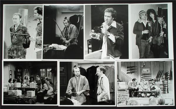 Splendid bound collection of 28 photographs of the original SNL cast, circa 1975, performing during the show and cavorting at post-show parties. Includes John Belushi in his legendary Samurai get-up and with Aerosmith's Steven Tyler, Gilda Radner cozying up to Warren Beatty, Chevy Chase, Dan Aykroyd, Jane Curtin, Laraine Newman, producer Lorne Michaels. All photos NRMT.