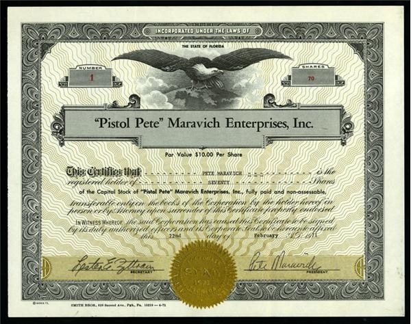 Personally owned stock certificate for "Pistol Pete" Maravich Enterprises, Inc. bearing the new NBA star's signature and type written name along with the company's raised golden seal. Dated February 22, 1971, in the amount of 70 shares, it is signed flawlessly in black ink which grades a 10/10. The document has only its original folds and is in EX-MT condition.