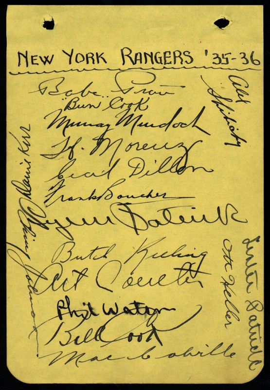 Fantastic fountain pen signatures, 17 in total, grace this page from a very vintage autograph book. The 1935-36 Rangers included the legendary Howie Morenz in their line-up for 19 games. Howie's autograph leads the Hall-of-Fame cast which also includes Rangers legends Lester and Lynn Patrick, Bill and Bun Cook, Frank Boucher, Ching Johnson, Art Coulter and Babe Pratt. Others are Davey Kerr, leading scorer Cecil Dillon, Murray Murdoch, Alex Shibicky, Ott Heller, Mac Colville, Butch Keeling and rookie Phil Watson. In can’t-hope-for-much-nicer condition.