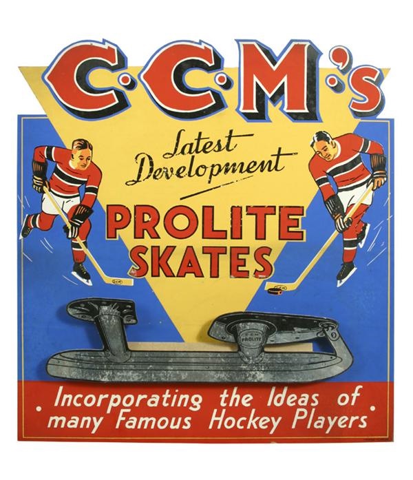 Brilliant blue, yellow and red jumps at you from this eye-catching 1930’s die-cut store advertisemnt pitching CCM’s latest development, Prolite Skates. A cardboard skate blade has ingeniously been applied to a folding piece of cardboard which gives a 3-D effect. The bottom reads “Incorporating the ideas of many Famous Hockey Players”. The ad on thick sturdy cardboard measures a little over 19 x 21” and is in tremendous condition with just a couple of tack holes in the letters at the top.