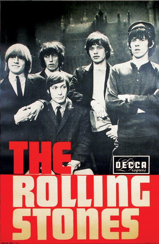 This evocative vintage Stones poster from France in 1965 is one of only two known to exist. The poster accompanied the band's appearance at L'Olympia auditorium in Paris on April 18, 1965. It depicts the original 5 Stones standing together in London. Below the photograph it says, "The Rolling Stones" in big white letters on a red background. The Decca records label is on the right side and says, "Decca Disques". The poster measures approximately 30 x 47" and is matted in a lovely black frame. EX-MT. One of two known to exist.