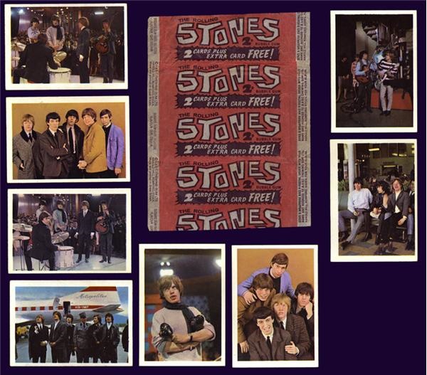 Extremely hard-to-find A&BC card set (40) that came with Rolling Stones bubble gum in the mid-1960s. Great full-color candid images of the young Stones both as a group and individually. All cards NRMT. Includes original red wrapper, also NRMT.