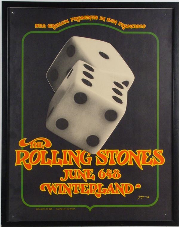 The Stones played Bill Graham's Winterland Theater on June 6th and 8th, 1972, a signal moment in the storied history of rock and roll in San Francisco. The poster for the concerts is a gem of simplicity, a minimalist image of two "tumbling dice" against a black backdrop, with the familiar Fillmore style psychedlic printing in bright orange and yellow on top and bottom and a green border line. Poster is under glass in a black frame. The piece is NRMT, the only flaws being small tacking holes at the corners.