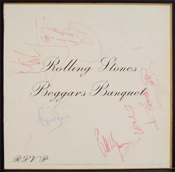 "Beggars Banquet", arguably the Stones' best album, contains twin anthems of evil and social degredation "Sympathy for the Devil" and "Street Fighting Man" (in which Jagger actually cops out on violent protest). It was released in November 1968, solidifying their immense influence on rock. This is an incredibly rare original copy of the album (record included) signed by the five Stones of the time. Four signatures (Jagger, Richards, Wyman, Watts) are in red marker, and somewhat smudged but readable, while Brian Jones' signature in blue ink is better, a good 8. Cream colored album sleeve is EX-NM. Accompanied by a LOA from the woman who received the signatures in Sweden in 1969.