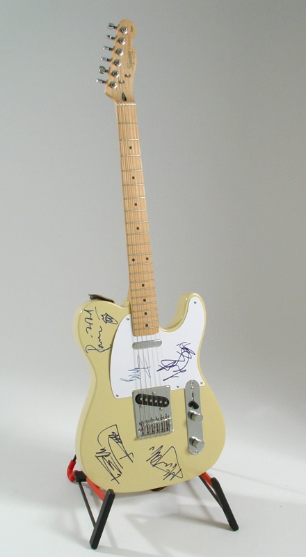 Squier Telecaster by Fender is signed by the Stones’ legendary line-up: Mick Jagger, Keith Richards, Ronnie Wood, Bill Wyman, and Charlie Watts. The signatures grade “10” out of a possible 10. The Fender itself is in NRMT condition, creme on white body, also including a guitar-strap embossed with Japanese characters. A “must-have” for any die-hard Rolling Stones collector.