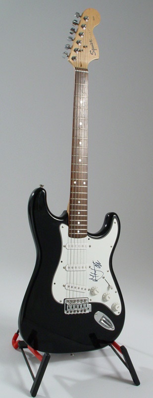 This beautiful black and white Squire Fender Strat is signed by Mick Jagger of the Rolling Stones in bold black sharpie just below the strings. Mick's signature rates a "9" out of a possible 10 on this perfect rock and roll symbol, a piece that is perfect for display. NRMT.