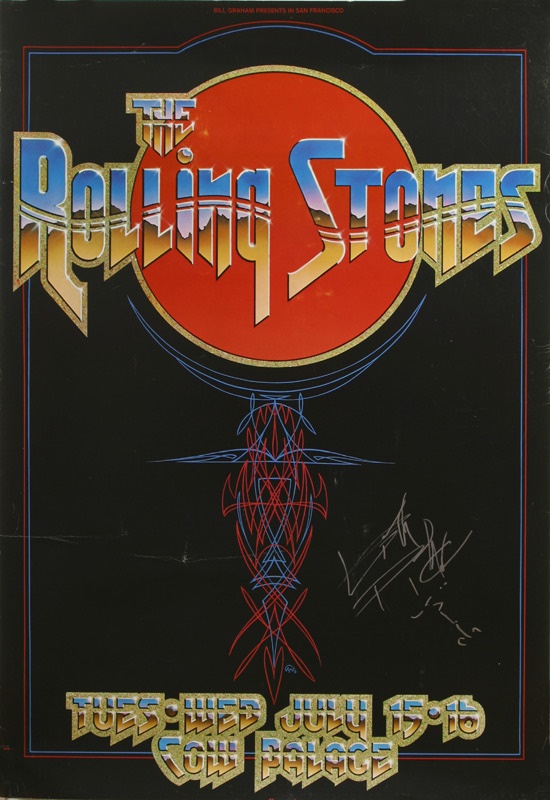 Stunning poster from the Stones' 1975 concert at San Francisco's Cow Palace comes with a memorable Keith Richards signature. The poster, designed by pop artists Kelly, Mouse and Tuten, is an art-deco delight, its black background pierced by "Rolling Stones" in lettered cutouts of a scenic landscape, a fiery red ball, fleeting blue and red flecks and a blue and red border. Richards signed in silver sharpie with a grade-9 signature, the mercurial letters perfectly matching the motif. Poster is 22 x 33" and in mint condition.