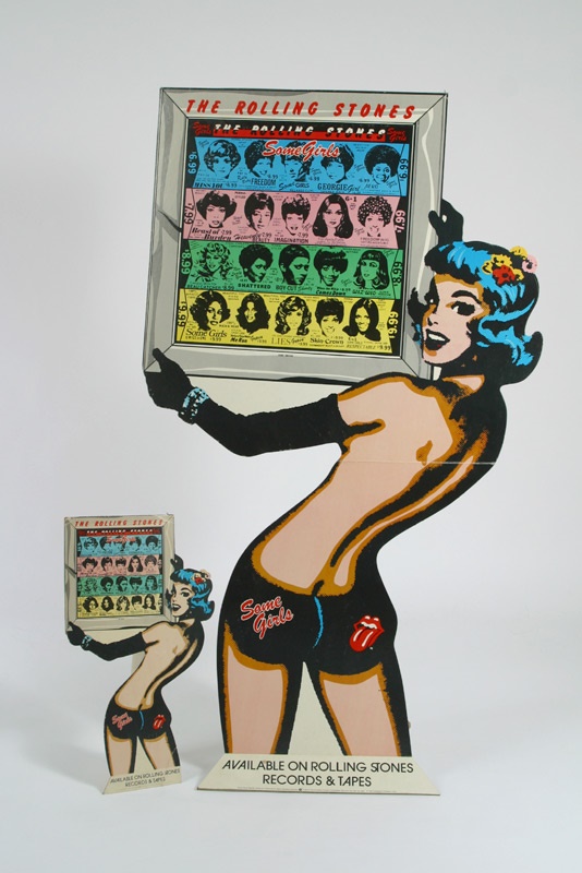 "Some Girls" was the Stones' "disco" album but with no compromise, as typified by the songs "Miss You" and "Shattered". The LP with its famous 4-color cover cribbed from an inner-city beauty parlor, was promoted to death in 1978, including with this amazing display depicting "some girl" with blue hair and a "Some Girls" on her butt holding up the cover. 2 displays, one full-size 49" tall, and a smaller 19" version. Both on cardboard. Not only NRMT but jaw-droppingly cool.