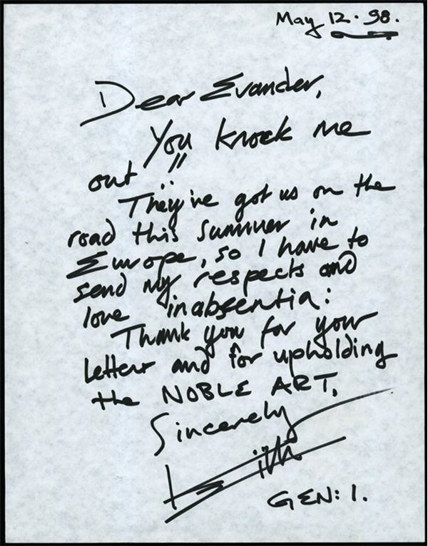 A letter from the gnarled Stones guitarist who has been called "Walking Death" to a guy who can made opponents feel like just that in the ring, heavyweight champ Evander Holyfield. Dated May 12, 1998 the letter reads, "Dear Evander, You knock me out!! They've got us on the road this summer in Europe, so I have to pay my respects and love in absentia. Thank you for your letter and for upholding the NOBLE ART. Sincerely, Keith." Bold strokes with a black sharpie, grading 8/10. White paper is 8 x 10" and NRMT.