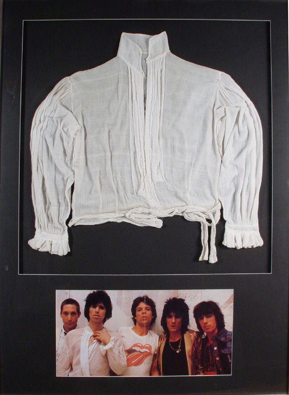 This white puffy "pirate-style" shirt was worn by Keith Richards of the Rolling Stones in concerts and photo shoots during the 70s. Designed by Prince "Stash" Klossowski de Rola in 1975, Richards "borrowed" it for the Stones' tours of both Europe and the States, eventually returning the shirt to its original owner. It shows good use and comes in a handsome silver-colored frame measuring approximately 43 x 56". Below the shirt is a striking color photo of the Stones measuring approximately 22 x 12", showing Richards wearing this classic top. Also accompanied by two other images of Richards wearing the shirt. EX-MT to NRMT.