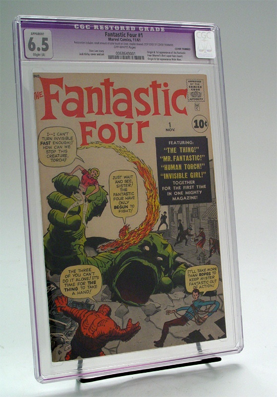 The very first issue of "The Fantastic Four" was released in November 1961. This group of superheroes, created by Stan Lee, feature The Thing, Mr. Fantastic, The Human Torch and Invisible Girl. The premier issue features all four members of the FF on the cover battling a large green monster. Some minor restoration which includes minimal color retouch to cover and staples cleaned. This issue has a CGC grade of 6.5 for fine+ (off white pages). Hard to find this vaunted "first issue" comes from the Charlie Sheen collection.