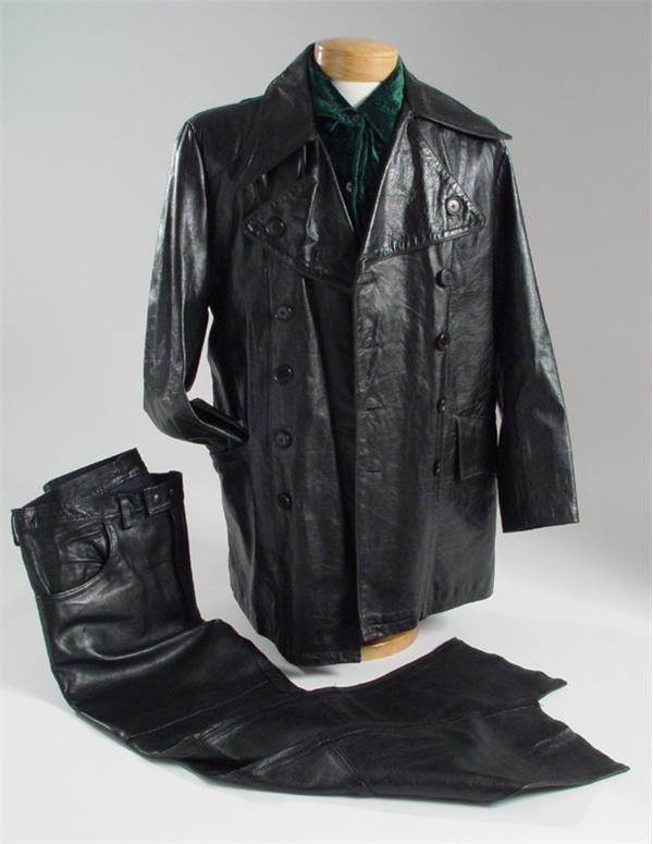 You can’t get any closer to the Stones than this! The clothing in this collection was worn by Ron Wood and Keith Richards on stage during the Steel Wheels Tour in 1989. Start with rugged black leather double-breasted trench coat worn by Ron Wood, perfect for renditions of "Undercover of the Night". Manufactured by Ace, it’s a size large and features multiple black buttons and a stylish black collar. Also included in this collection is a pair of black leather pants and a forest green velvet shirt worn by guitarist Keith Richards, perfect for "Little T&A", perhaps. The pants are made by Fieldsheer in England and show some wear but are in NRMT condition. Richards' crushed velvet shirt also shows some wear but is in NRMT condition. All items come with a LOA.
