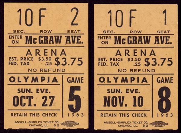 They called him "Mr. Hockey." His goal scoring ability and playmaking skills defined an era. Before Wayne Gtetzky came along, Gordie Howe held the all time goals record (801) and points (1,850). He was the NHL MVP six times - all while playing for the Detroit Red Wings. Played an unheard of 32 seasons in all some with the WHA. These two ticket stubs (1 1/2 x 2") are monumental collectors items. They mark when Howe tied then beat Rocket Richard's all time goal record. Ticket stubs are dated "Oct. 27 and Nov. 10 1963." Mint condition.