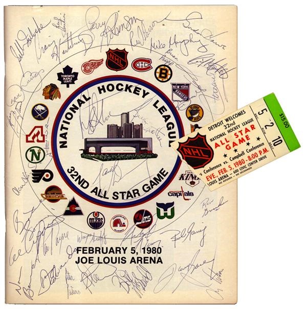 This 1980 NHL All-Star Game Program is a milestone if history, a measure of things past and things to come. Played in Detroit's Joe Louis Arena, was Gordie Howe's last All-Star Game and Wayne Gretzky's first, and both supernovas signed the cover of the pgoram along with 31 other hockey greats including Larry Robinson, Bob Gainey, Mike Murphy, Ron Greschner, etc. All signatures in black pen rate 8s and 9s with How's particularly strong. The program itself is EX and comes with a ticket stub from the game and a league news release.