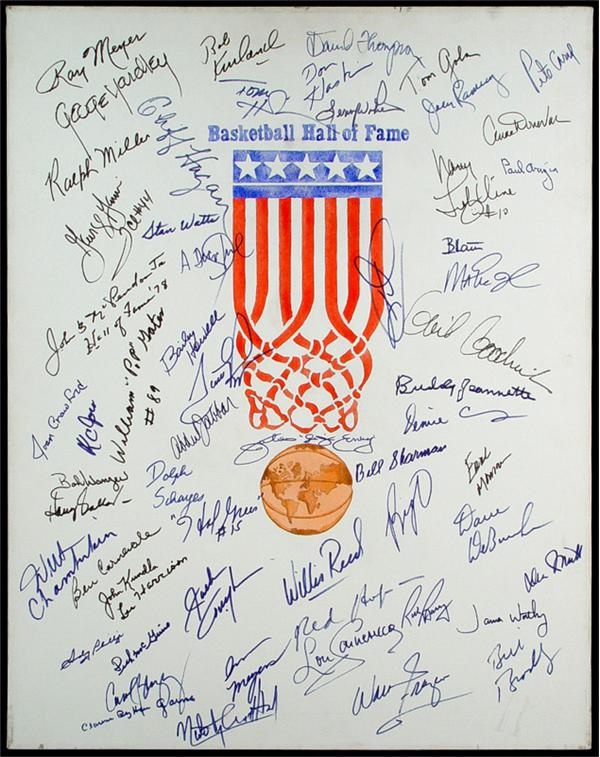 Marvelous white canvas with the Basketball Hall of Fame logo over a globe shaped like a basketball measuring approximately 24" X 30" and signed in bold blue and black sharpie by over 35 legends of the hardwood. Signers include Julius Erving, Wilt Chamberlain, Kareem, George Gervin, Willis Reed, Dolph Schayes, Walt Frazier, David Thompson, Earl Monroe, Nate Archibald, Red Auerbach, Dave DeBusschere and many, many more. Signatures are clear and average a "9.5" out of a possible 10. The canvas is NRMT.