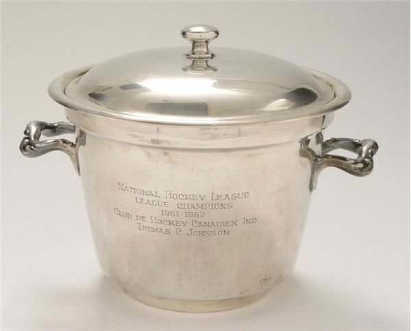 Silver-plate two-piece ice bucket presented by the NHL to Hall-of-Famer Tom Johnson as a member of the League Champion Montreal Canadiens in 1961-62. The side is engraved with "National Hockey League Champions, 1961-62, Club de Hockey Canadien Inc., Thomas C. Johnson". Eight inches from the base to the handle. In Excellent condition.