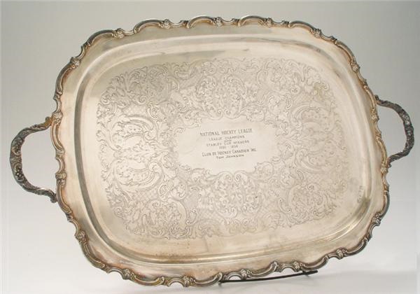 Exquisite and ornate shining silver serving platter presented to Habs' Hall-of-Famer Tom Johnson. A central engraving reads “National Hockey League Champions & Stanley Cup Winners, 1955-56, Club de Hockey Canadien Inc., Tom Johnson." A cherished memento from the period prior to the presentation of the better known miniature Stanley Cup trophies. From the collection Tom Johnson with his signed Letter of Authenticity.