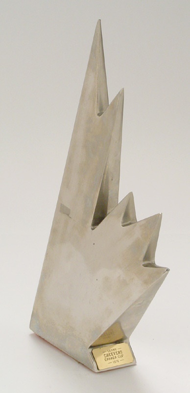 Boston Bruins Hall of Fame goaltender Gerry Cheevers was given this beautiful twelve-inch trophy to commemorate his part in Team Canada’s victory over Czechoslovakia in the 1976 Canada Cup Tournament. This heavy silver-plate trophy in a demi-leaf design holds a small plate at the base engraved with the words “Gerry Cheevers, Canada Cup 1976.” In excellent condition with light pitting but none of the cracking found on most examples of this award. From the personal collection of Gerry Cheevers with his signed Letter of Authenticity.