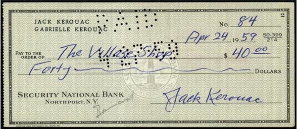 Where have you gone, Jack Kerouac? The "Beat Generation" avatar who wrote the classic novel of disillusionment, "On the Road", in 1957 is gone 25 years now but his observations and biting wit are so missed that the original draft of "On the Road" -- for which Indianapolis Colts owner Jim Irsay paid $3 million in 2002 -- was given a national tour this year of museums and libraries. Kerouac wrote this $40 check to The Village Shop on April 24, 1959, leaving a brilliant and much-sought-after signature that rates EX-MT, as does the light brown check.