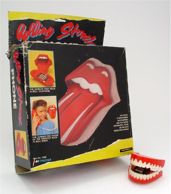 Stones promo lot consists of "Love You Live" wind-up chattering teeth with the original key and the Rolling Stone phone, made by Tristar in 1984, in the original box. Chattering teeth are mint, telephone itself EX+ and box, celephane is intact but box has wear, thus VG. Measures 12x9x4".