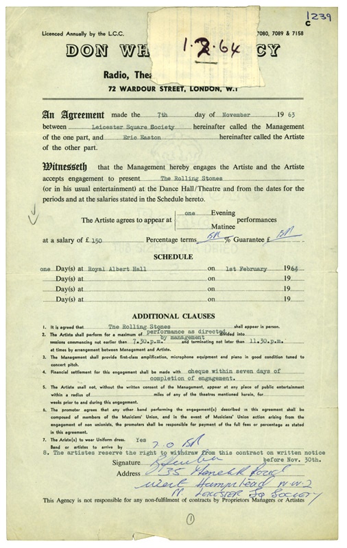 The Rolling Stones quickly outgrew the London club scene and moved on to larger venues like the venerable Royal Albert Hall, paving the way for many of rock's most memorable concerts in the joint (and a line in "Day in the Life" about "how many holes it takes to fill the Albert Hall"). The Stones agreed to play one concert on February 1, 1964 according to this agreement dated November 7, 1963 between the Hall's management and Stones manager Eric Easton. Their pay would be a mere 150 British pounds .Compare that to the millions they get today before they even take the stage!