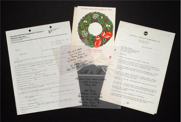 Interesting Stones arcanum. Includes 1) 7/14/65 letter from General Artists Corporation to the band's manager Eric Easton proposing an itinerary for a Stones' American tour; 2) Christmas card with the band's tongue logo and an envelope reading "Charlie"; 4) 2/14/86 NBC contract with Jerry Hall to host Saturday Night Live; 5) two-piece lucite invitation to the wedding of Bill Wyman and Mandy Smith on June 5, 1989. All pieces EX-MT.