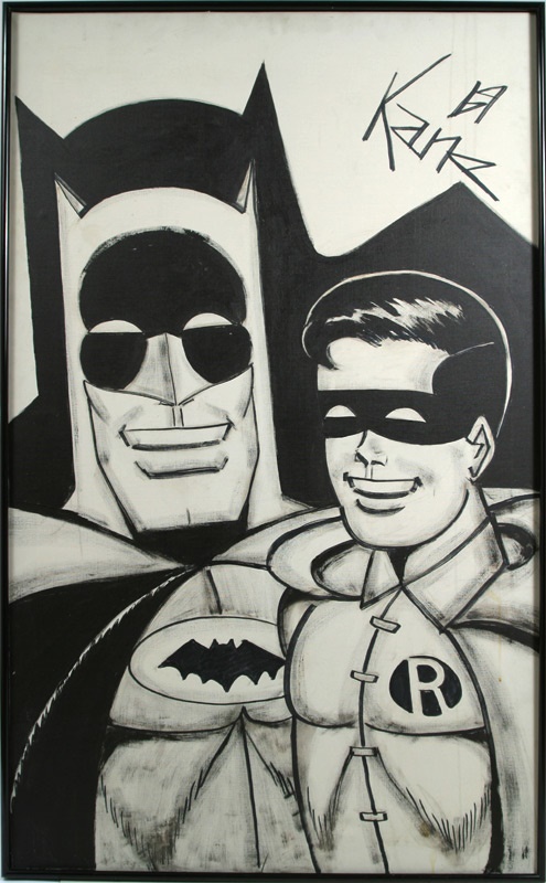 Formidable, striking black & white oil painting on canvas of Batman and Robin signed "R. Kane" (Bob Kane), who created the this super duo back in 1939. His interpretation of these superheroes was a cruder design consistent with the images on this painting. Painting was executed in 1969, measures 35 x 59" and condition is EX-MT.