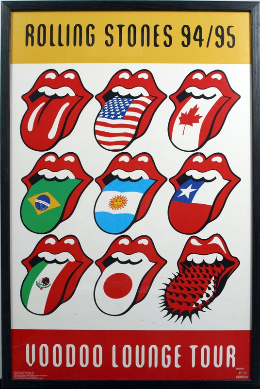Two beautiful Rolling Stones posters. A full color poster of Mick Jagger dating to 1979 for WPLJ Rock & Roll radio in New York. This poster measures approximately 27 x 11" and shows Mick wearing an open shirt in front of a sky at sunrise. Another poster measures 21 x 34" and has multiple lips and tongues with the flags of various contries and dates from the 1994-95 Voodoo Lounge Tour. It features "flags" of the US, Canada, Japan and other countries the Stones visited as part of this world tour. Both posters are professionally framed and NRMT.