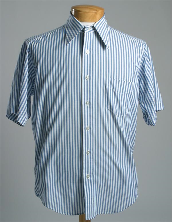 It may look more Beach Boys than Rolling Stones, but rest assured this blue candy-striped shirt was worn by Stones bassist Ron Woods. Collar label has been removed though there is a tag with size "M 15 1/2". Short-sleeved shirt is in perfect condition.